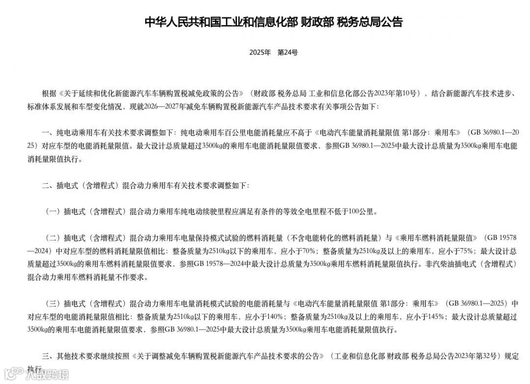 与此同时,2026年新能源车享受减免政策的技术门槛也大幅提升。根据最新的技术要求,插电式(含增程式)混合动力乘用车的纯电动续驶里程应满足有条件的等效全电里程不低于100公里,而现行标准仅为43公里,增幅高达132%。对于纯电动乘用车,百公里电能消耗量也较2025年标准难度提升13%-25%。