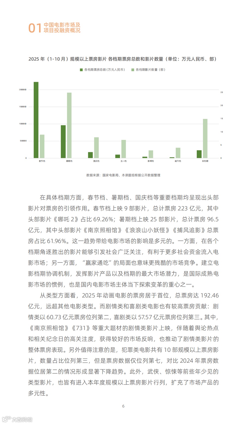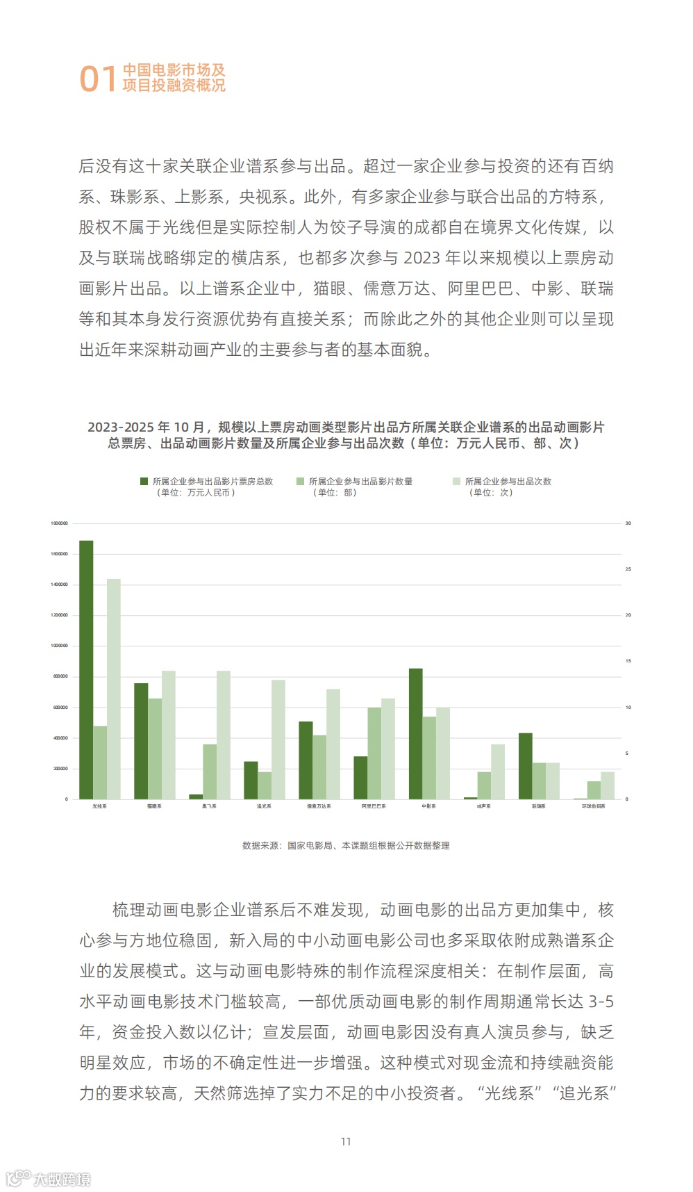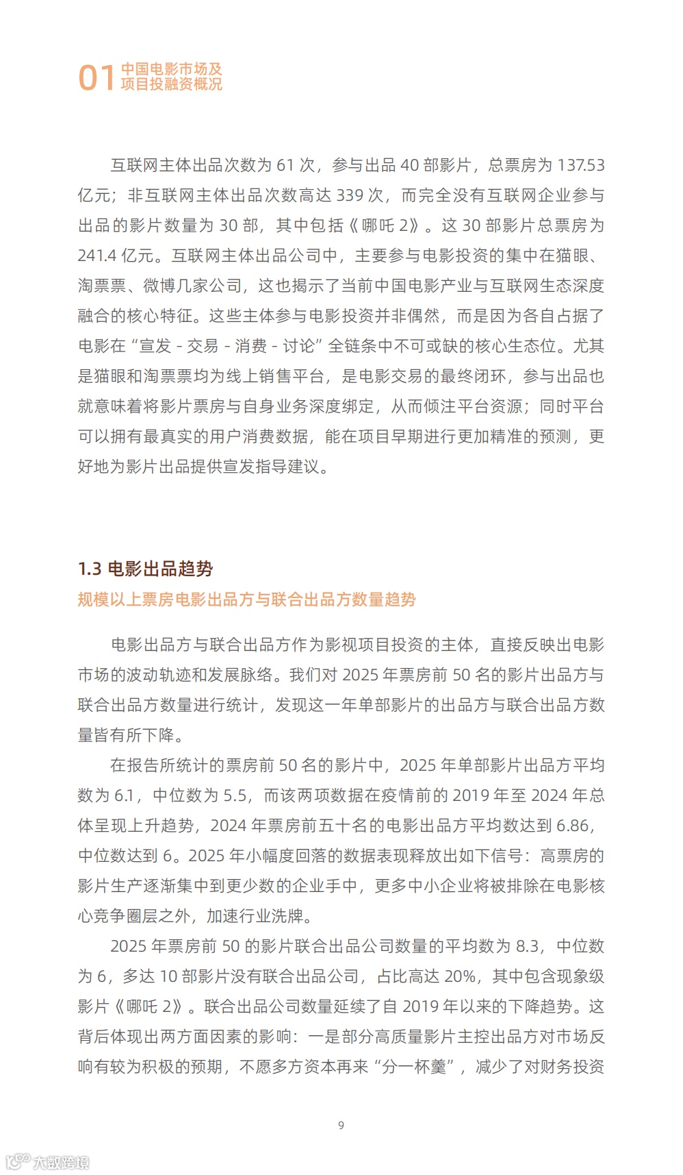 变化确实很关键。民营主体彻底崛起,非国有主体出品次数占比达73%,纯民营影片票房占比升至47%,比2024年足足提了33个百分点,像《哪吒之魔童闹海》这样的爆款就是民营企业主导的。上市主体更是掌握了行业话语权,84%的规模以上影片都有它们参与,贡献的票房占比高达94%,品牌号召力没的说。猫眼、淘票票这些互联网主体也深度绑定,通过“宣发-交易”生态参与投资。看得出来,民营主体成了内容创作的核心活力源,上市主体靠资本和资源优势掌舵,投融资结构正朝着“民营+上市”的双核心方向演进。