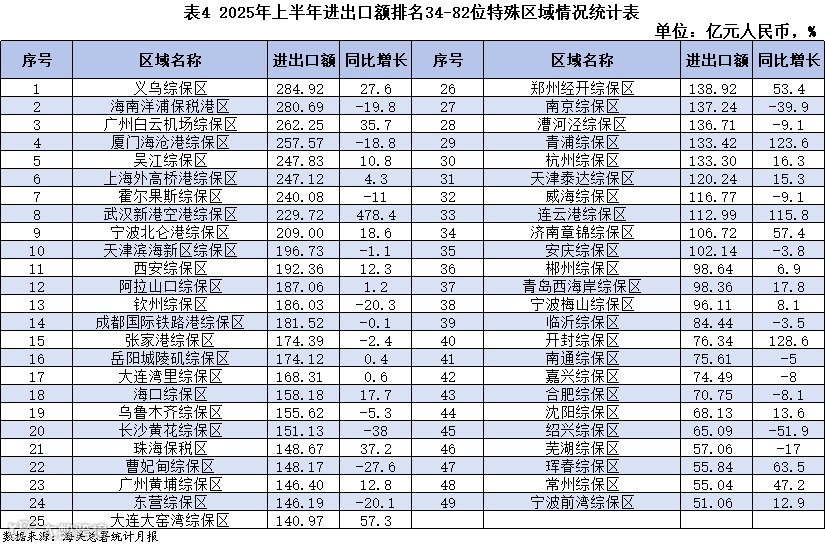 2025年上半年,在有可比数据的165个特殊区域中,93个实现进出口同比增长,占比56.4%,合计进出口32219.68亿元,占总量的76.6%。另有72个区域同比下降,占比43.6%。