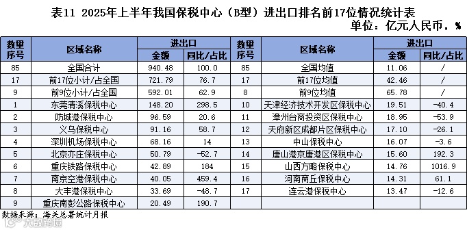 2025年上半年全国保税物流中心(B型)进出口情况:海关数据显示,上半年全国85个有统计的保税物流中心实现进出口总额940.48亿元,同比增长15.2%。其中出口280.8亿元(+27.2%),进口659.68亿元(+10.8%),整体发展态势良好。