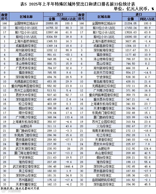 2025年上半年,全国166个有业务统计的特殊区域累计实现外贸进出口总额42062.90亿元,同比增长7.9%;其中出口20858.85亿元、增长12.0%,进口21204.05亿元、增长4.1%。进出口、出口和进口增速分别高于同期全国外贸整体增速5.0、4.8和6.8个百分点。