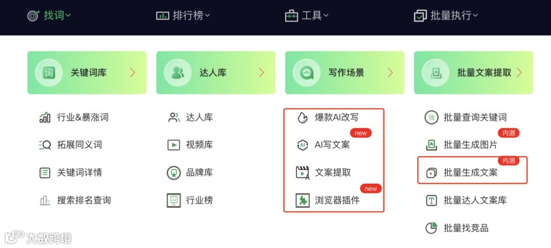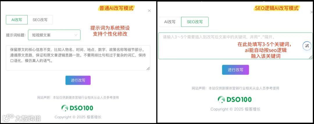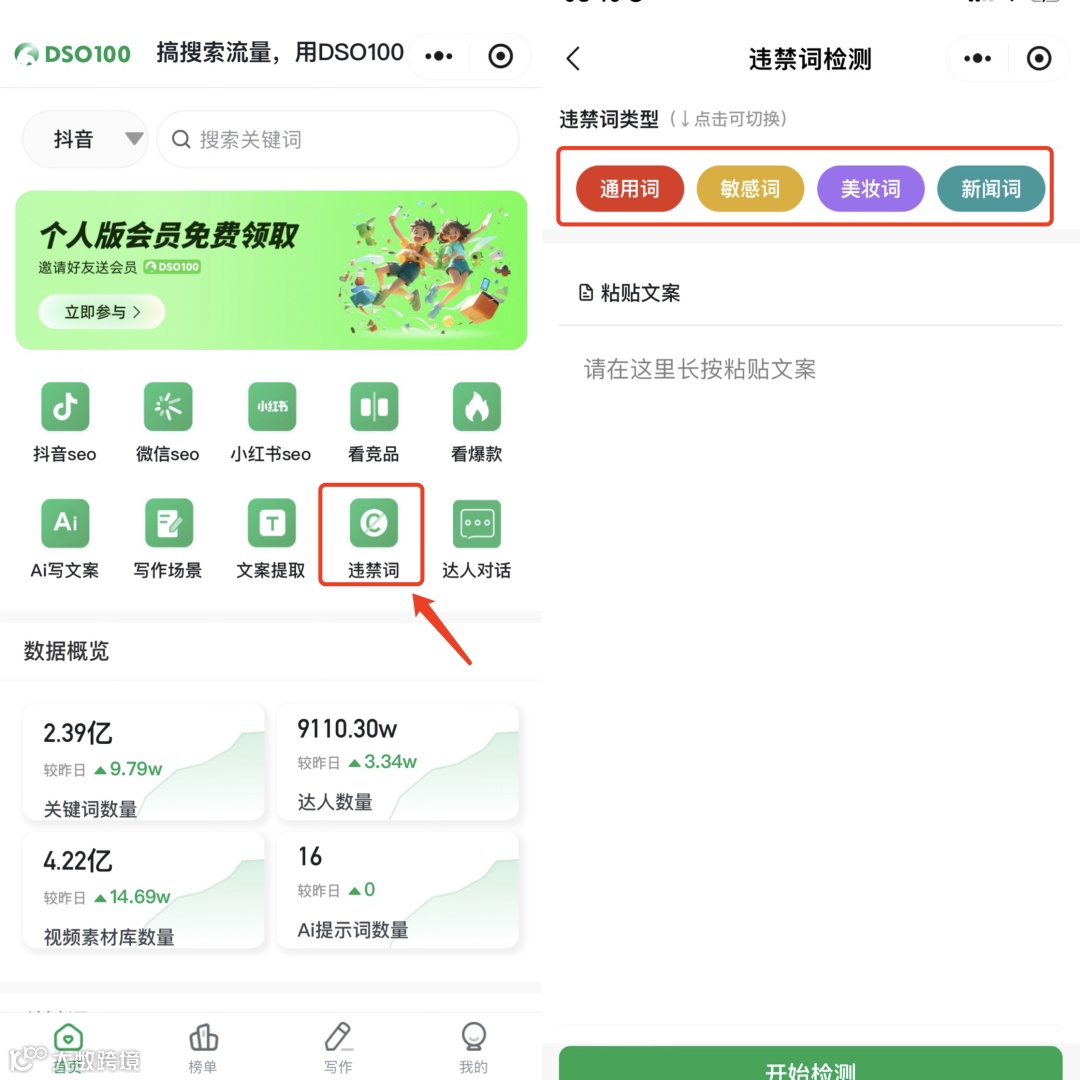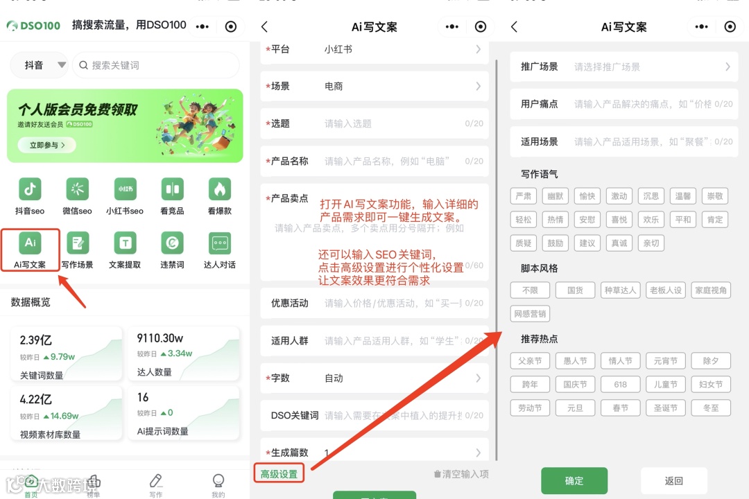 - 使用DSO工具可实现爆款文案提取、AI改写、AI生成、违禁词检测