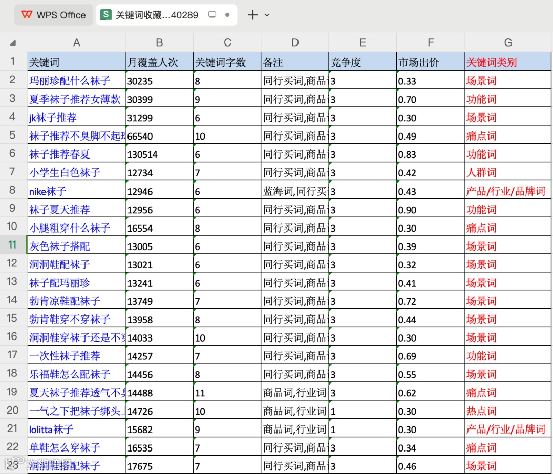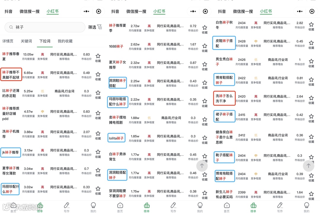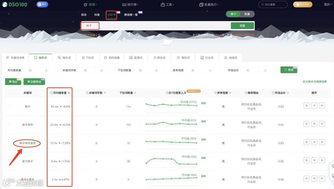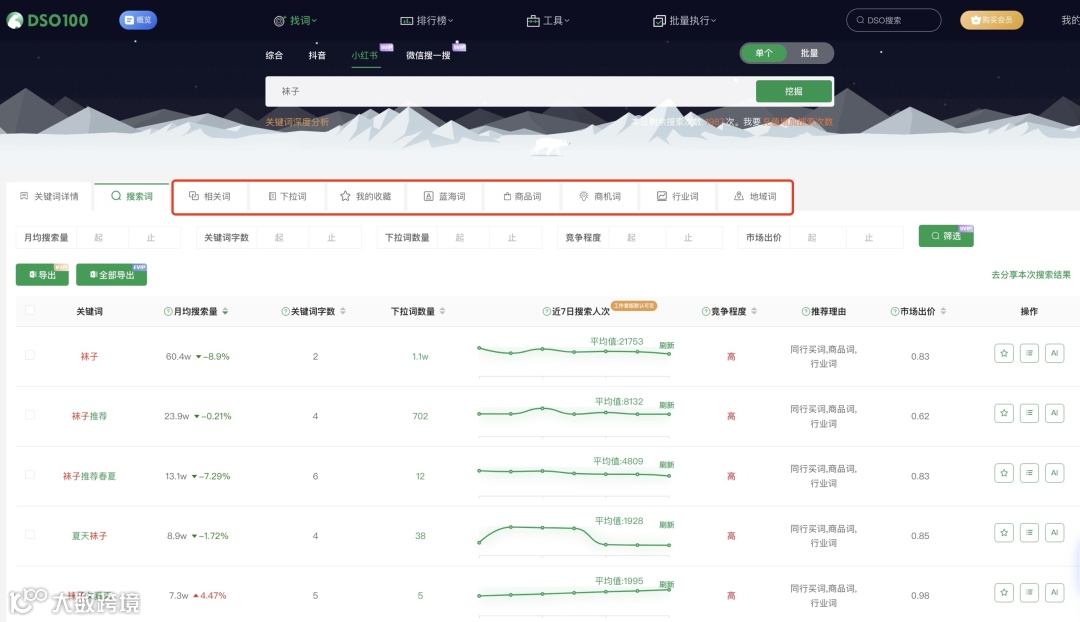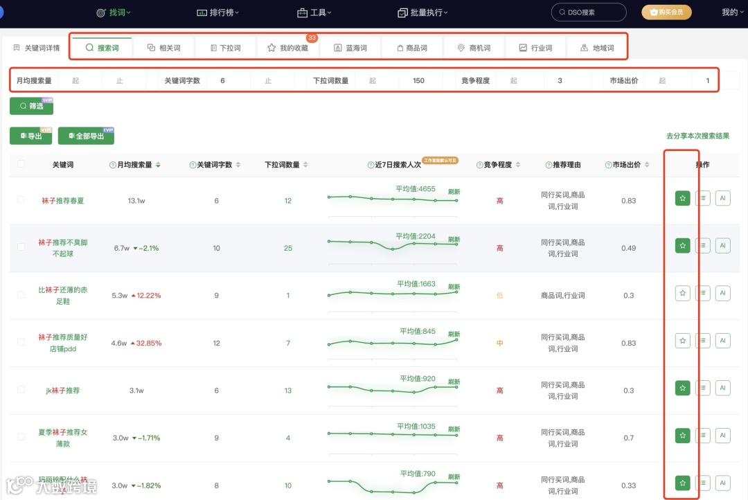 - 使用DSO工具输入行业关键词(如“袜子”),按月搜索量排序,挖掘高潜力长尾词