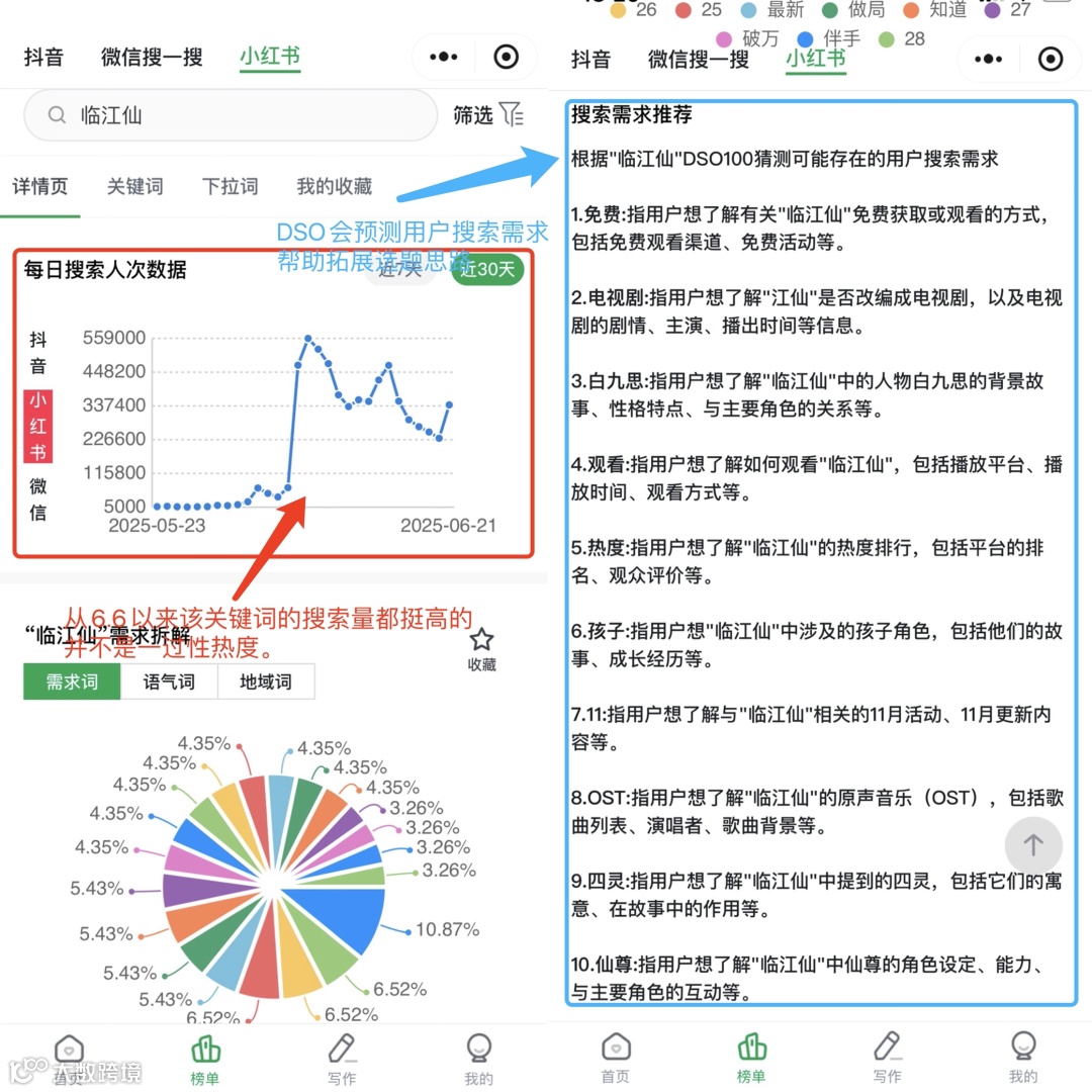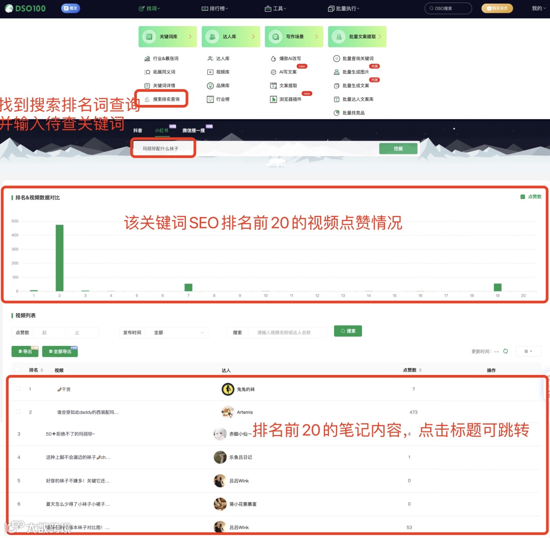- 验证:使用DSO“搜索排名查询”,分析前20名笔记点赞量与质量,判断是否可超越