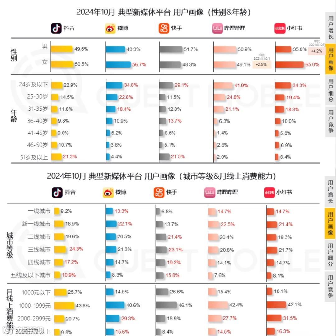 QuestMobile数据显示,小红书用户以40岁以下一二线城市女性为主,高收入人群占比较高,女性用户比例突出,具备强消费意愿与购买力。