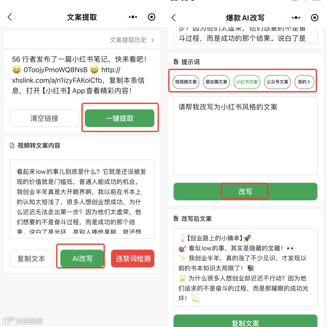 - 复制爆款链接 → DSO“文案提取” → “AI改写” → 选择“小红书图文”模式