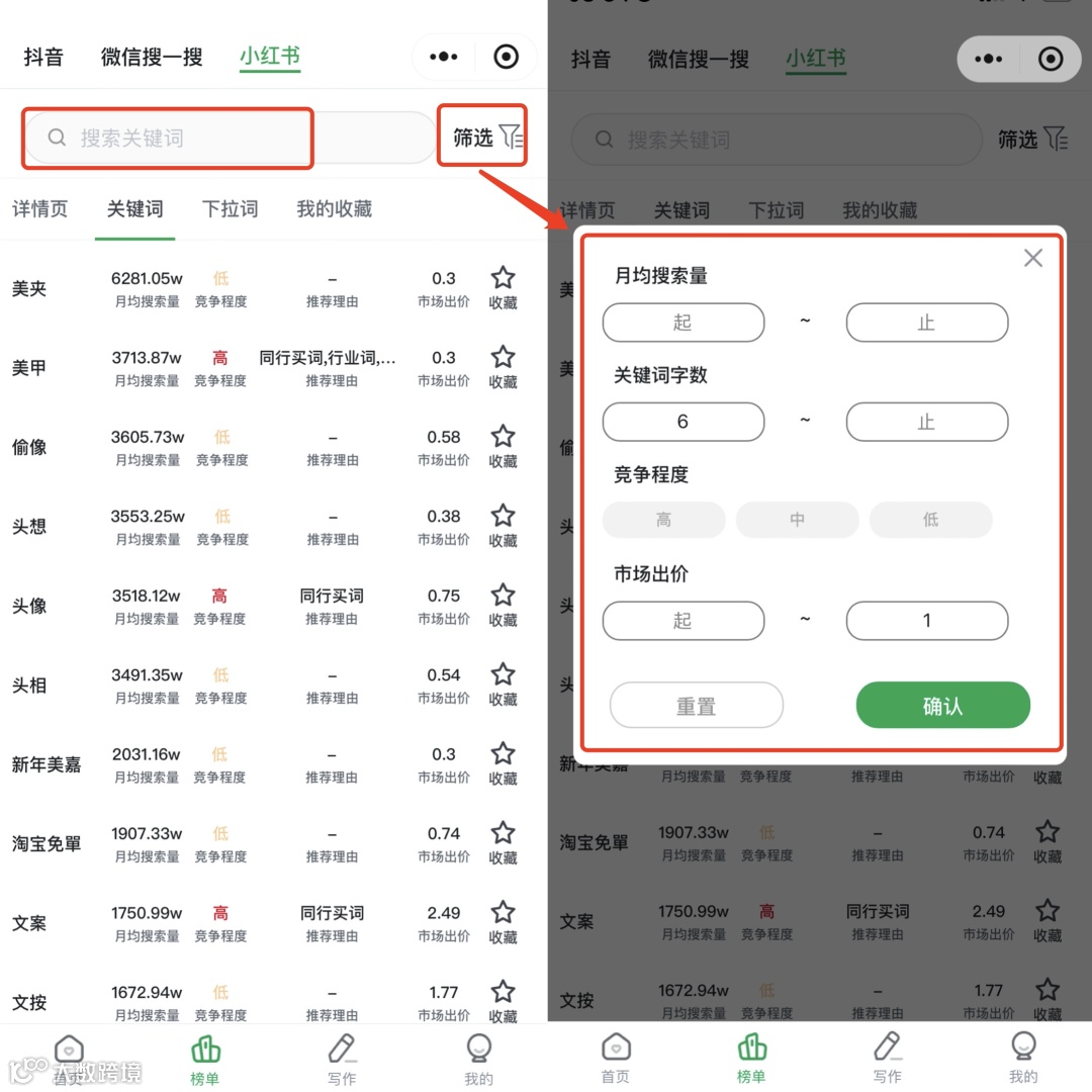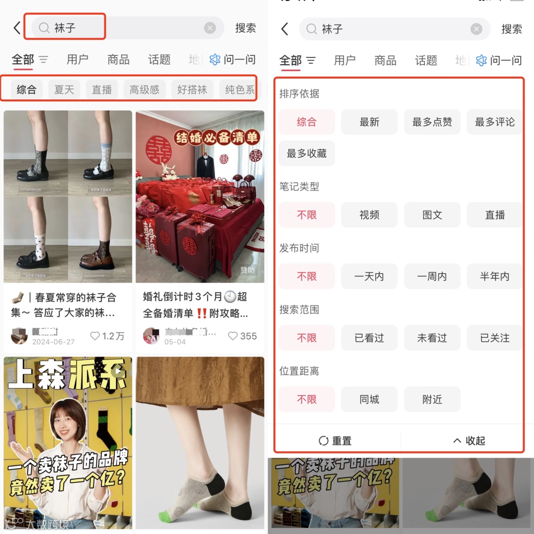 - 点击关键词跳转小红书搜索页,设置筛选条件分析爆款笔记