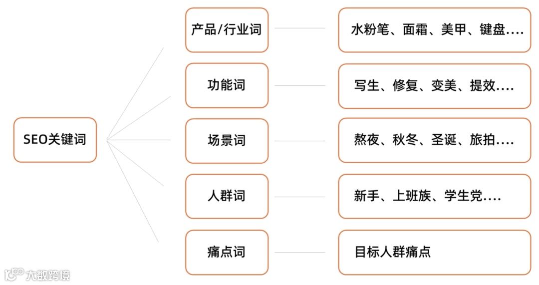 - 分词:产品/行业词、功能词、场景词、人群词、痛点词