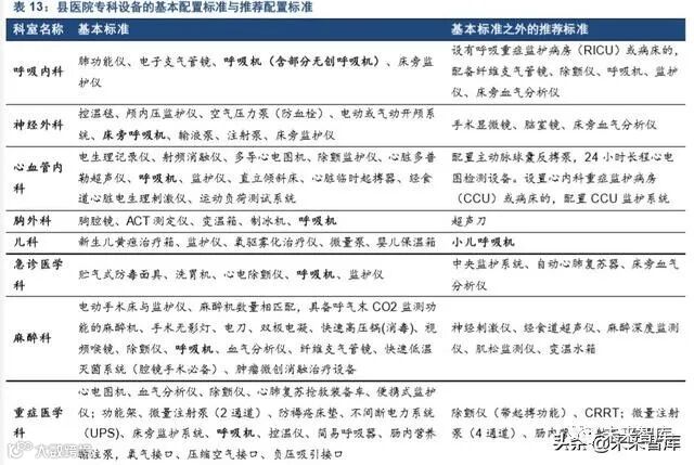 医用呼吸机作为医院急救和生命支持的重要设备,广泛用于手术室、各类监护病房和急救场所等。在医院建设中,国家卫计委也明确要求各级医院、医疗机构严格按照建设标准进行配置。2016 年 5 月,国家卫计委颁布《县医院医疗服务能力基本标准》和《县医院医疗服务能力推荐标准》,以贯彻落 实分级诊疗政策。卫计委在下发的通知中明确要求,各省级卫生计生行政部门要遵照执行,县级医院总 计 31 个医疗科室或治疗中心,其中有 8 个科室明确要求配置呼吸机。