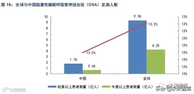 中国 OSA 发病率高达 13%。《柳叶刀》研究显示,全球约 9.36 亿成年人患有轻度至重度阻塞性睡眠呼 吸暂停(OSA),其中约 4.25 亿人为中度至重度患者,发病率高达 13.2%。其中,中国地区,AHI≥5 次/小时的人数达到约 1.76 亿人,AHI≥15 次/小时的人数达到约 0.66 亿人,可确诊中度及以上的发病人数 为 0.66 亿人,发病率高达 13.0%。