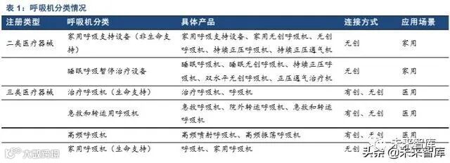 医用呼吸机为三类医疗器械,常规家用呼吸机为二类医疗器械。根据 2017 年版《医疗器械分类目录》来 看,家用呼吸支持设备(非生命支持)、睡眠呼吸暂停治疗设备属于二类医疗器械,一般用于家庭;治疗 呼吸机(生命支持)、急救和转运用呼吸机、高频呼吸机、家用呼吸机(生命支持)属于三类医疗器械, 兼具无创与有创的连接方式,多在医疗机构使用。