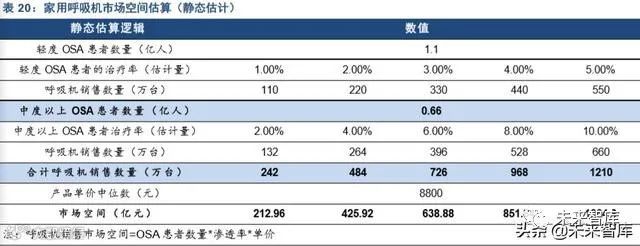 国内 OSA的整体治疗率低,约为 0.1%。据此我们估算全国 OSA 治疗患者人数约为 20 万人,中度及以 上的患者数量约为 10 万人,随着 OSA 的认知率与治疗率有待提升,约1 亿人的需求市场将拉动治疗产 品的不断放量,其中 NPPV 作为一线治疗手段,将促进睡眠呼吸机的市场销量不断增长。