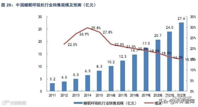 据公开资料统计,自 2011 年到 2015 年,中国睡眠呼吸机市场销售规模由3.2 亿元增加到 8.3 亿元,年 均复合增速为 26.9%。近年来,随着 OSA 患者的认知率的不断提高,而且生产企业将销售渠道拓展到 零售端,增加产品的可及性,预计睡眠呼吸机销售规模将有望从 2015 年的 8.3 亿元,增加到 2022 年的 27.6 亿元。