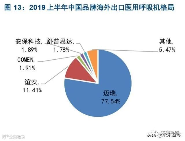 医用呼吸机海外出口强劲增长,迈瑞医疗一家独大。根据 2019 年上半年统计数据来看,迈瑞已经基本 垄断医用呼吸机的海外出口,占比达 77.54%,通过比较迈瑞、谊安、CMOEN 三家企业来看,同比增 长迅速,海外市场依然有强劲市场需求。