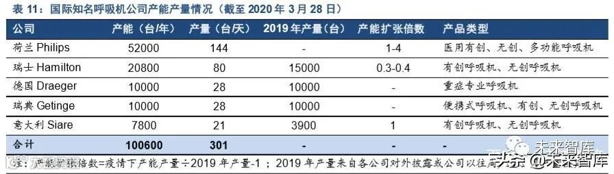 国外知名呼吸机企业积极扩产,优先弥补本国防疫需求缺口。飞利浦 Philips 每周生产大约 1000 台呼吸 机,计划在未来八周内(2020.03.23-2020.05.18)产量翻一倍,在第三季度前实现四倍产能提升;意大 利国内最大的呼吸机制造商 Siare 产量已经翻倍,每周可生产 150 台,且推迟了向印度等其他国家的交 货,以满足本国需求;德尔格 Draeger 已经接受德国政府1 万台重症监护呼吸机的订单;瑞士的 Hamilton 医疗目前已经将年产量提高了 30%到 40%,每天可生产大约80 台呼吸机。五大国际知名呼吸机厂家合 计产能约为 301 台/天,难以在短期内满足本国防疫需求,国外出口订单更是紧张。