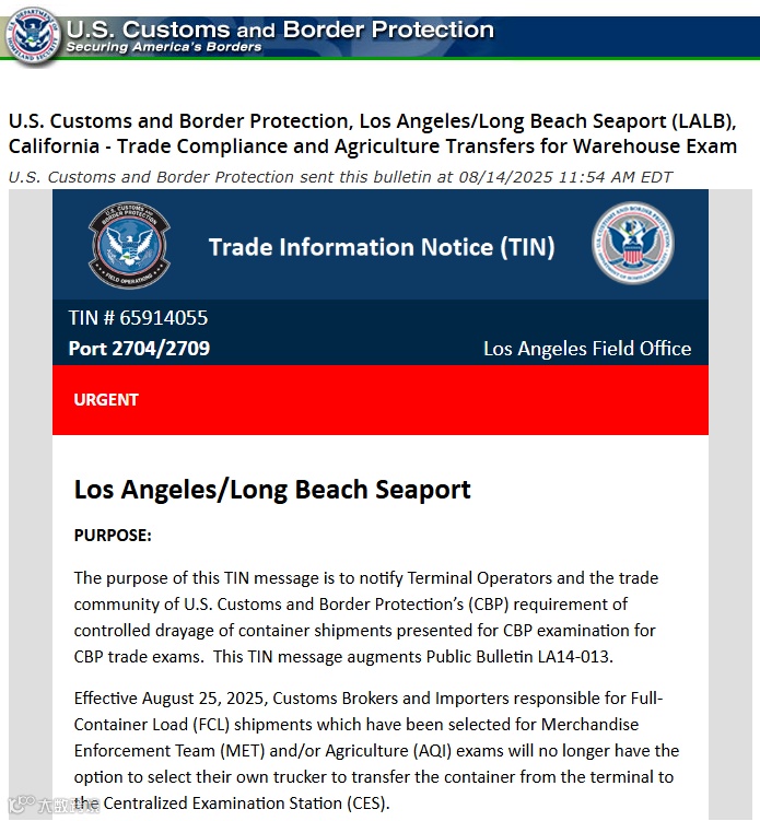 整柜货(FCL)查验规定:自2025年8月25日起,若货物在洛杉矶/长滩港被抽中MET(商品执法)或AQI(农业检查)查验,货主及报关行不得自行安排拖车公司,所有运输必须由查验场(CES)指定或关联车队执行。退运货物同样需由查验场统一安排。