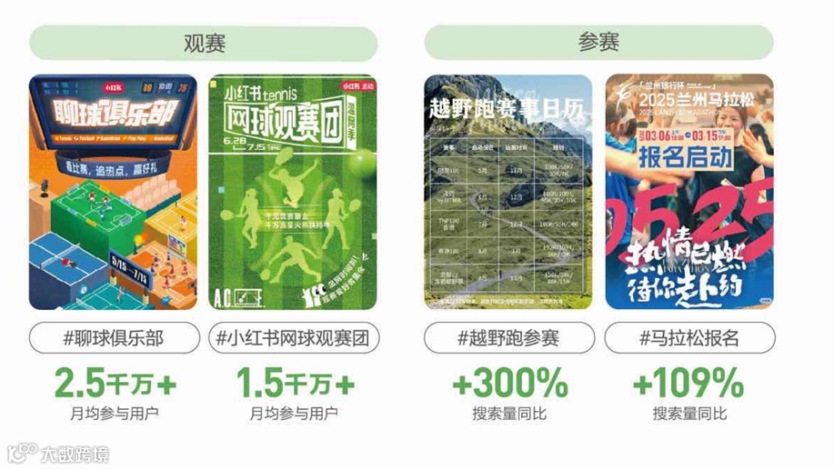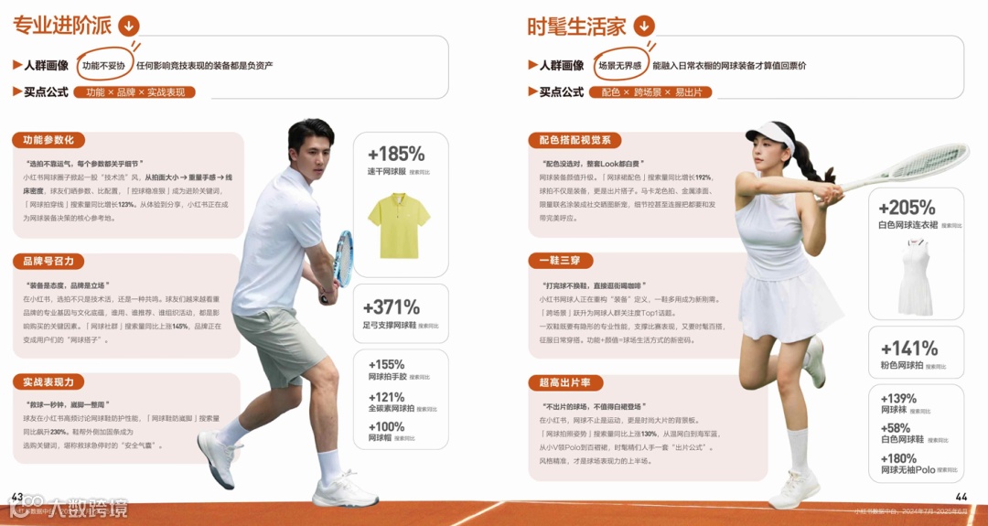 品牌需找到自身优势与用户需求的“黄金交叉点”。以“红土网球”为例,衍生出“专业进阶派”与“时髦生活家”两类人群:前者关注足弓支撑网球鞋(搜索量同比+371%)、速干球服(+185%);后者追求穿搭美感,“一鞋三穿”“网球裙配色”成热词。