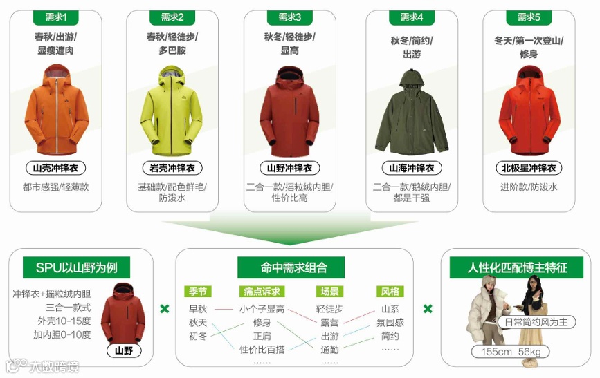 以大单品为支点,可拓展“1+N”种草模型,实现同一场景下的关联品类渗透。伯希和以岩壳、山壳、山野、山海系列冲锋衣为核心,延伸至防晒衣、羽绒服等品类,构建徒步场景下的产品矩阵,强化品牌心智。