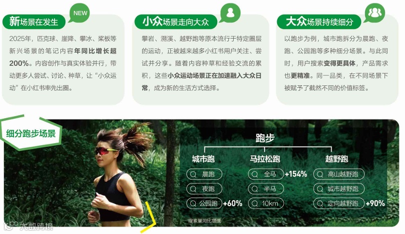 运动户外用户需求正随场景丰富而不断细分。以跑步为例,已衍生出晨跑、夜跑、公园跑等具体场景,不同场景对应差异化产品需求。攀岩、溯溪、越野跑等小众运动逐步破圈,匹克球、崖降、攀冰、桨板等新兴场景笔记内容同比增长超200%。