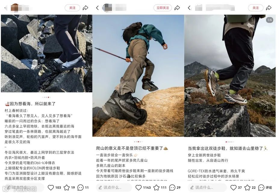 可隆跨世徒步鞋以“暴雨中仍干爽的徒步伙伴”“每一步都不磨而合”等场景化表达,精准触达露营人群对舒适与实用的需求,快速建立认知。