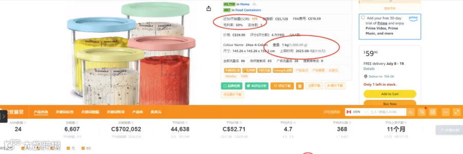 单量:在卖家精灵中显示上架时间是2023年08月12号,目前为止持续销售318天,30天销售量171,,