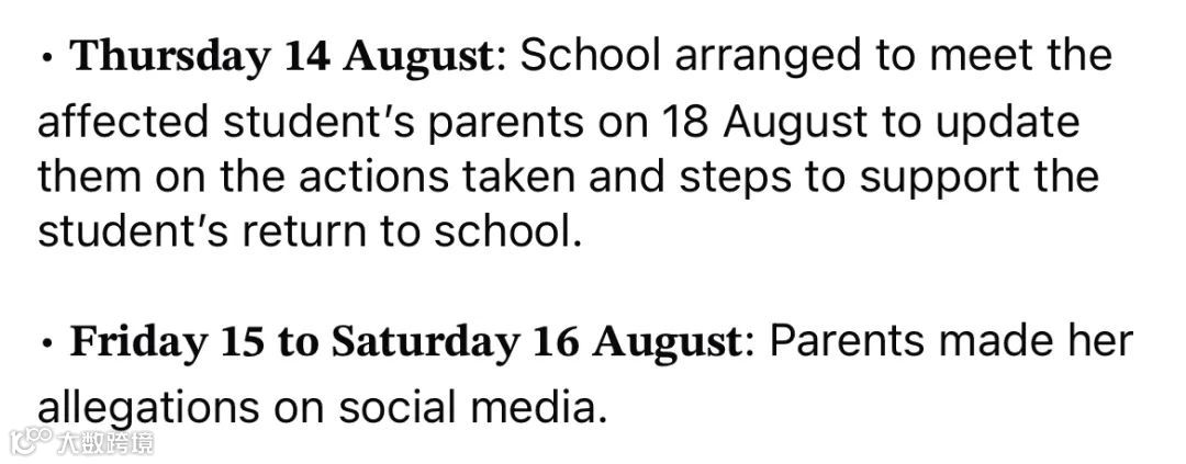 - 8月15日至16日:女生母亲在社交媒体发文指控校方未处理相关问题,质疑学校没有采取安全措施。