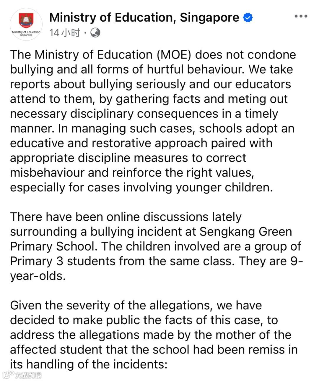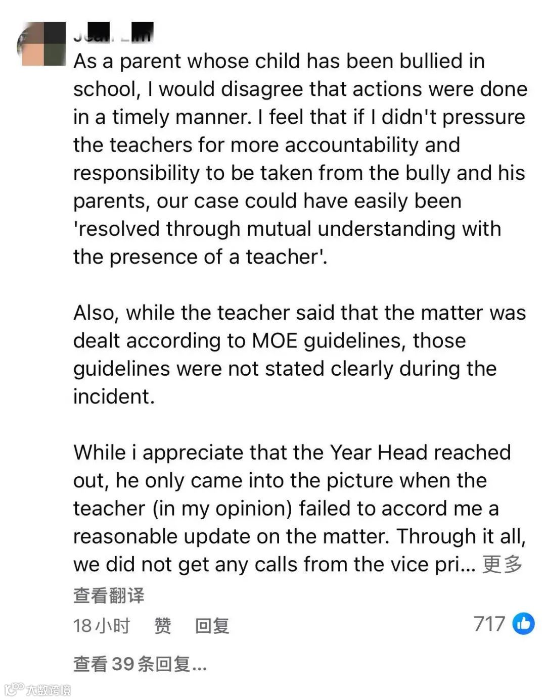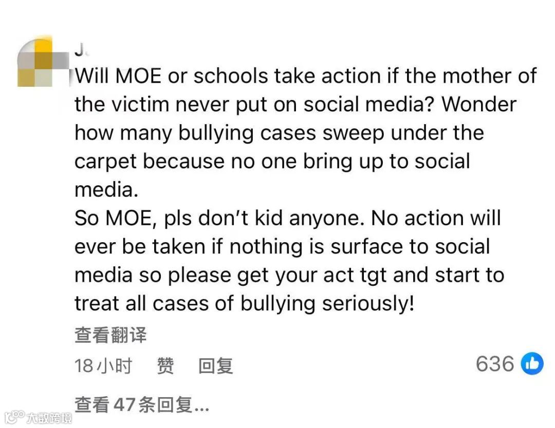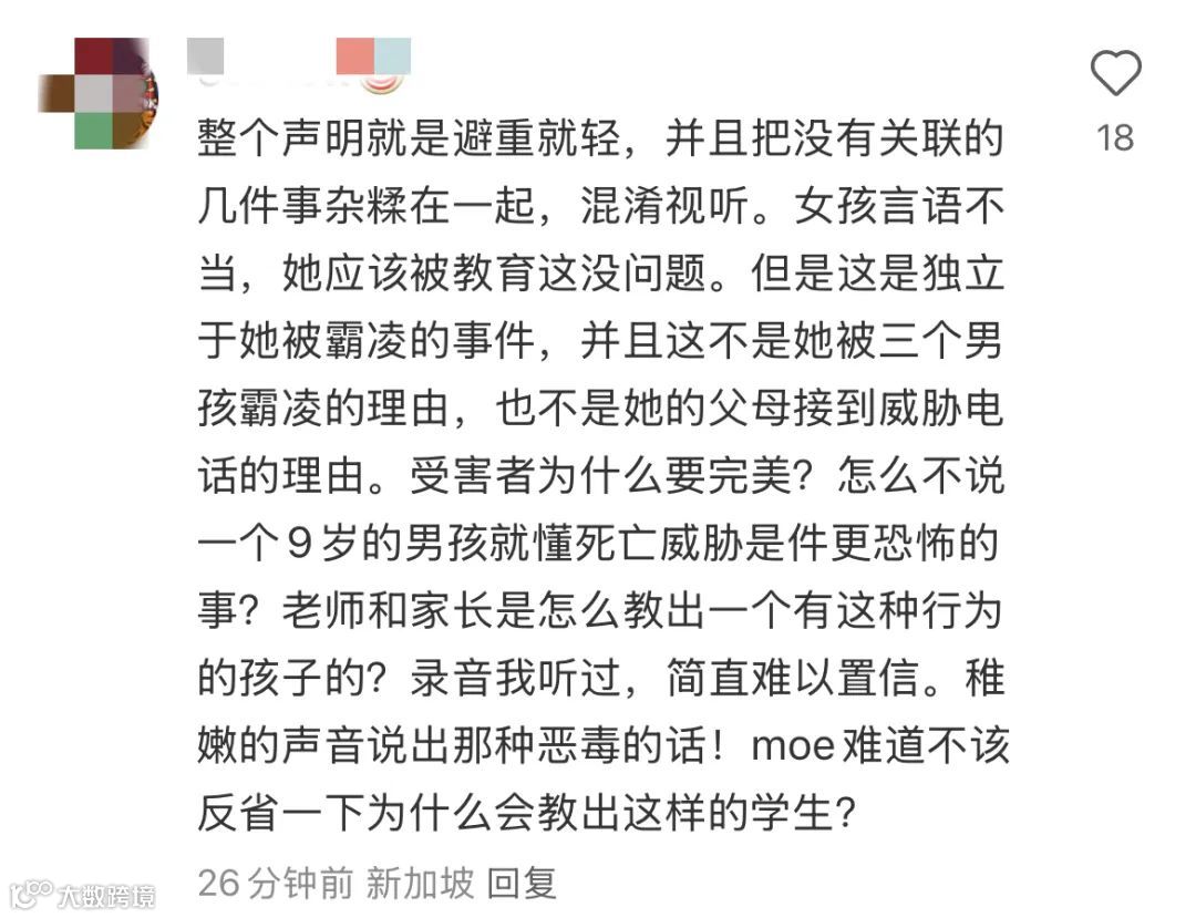 对此,教育部重申立场:“我们绝不会姑息任何形式的欺凌行为。可截至目前,还是有很多网友在表达愤怒。从MOE脸书帖文下的评论内容可以看出很多家长对此结果并不满意。