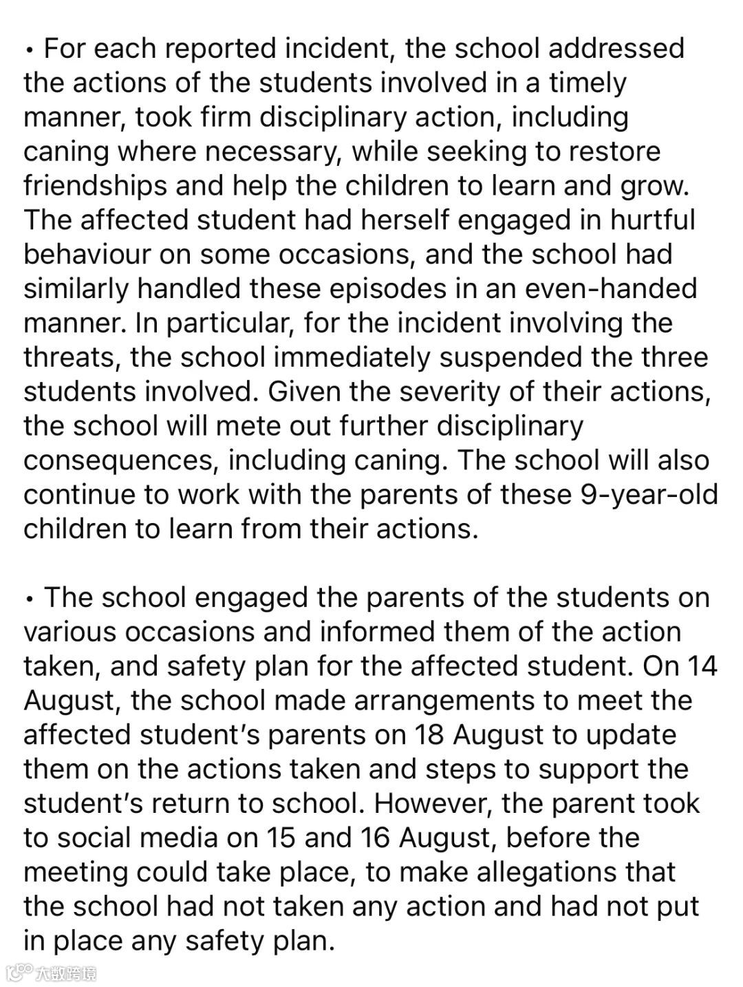 教育部指出,霸凌事件发生后,涉事的3名男学生早已受到纪律处分,包括停课处理和打藤鞭。校方也已第一时间与受影响女学生的家长沟通,并于8月18日进行面谈,历时超过四小时,双方就事件的来龙去脉进行了详细交流。
