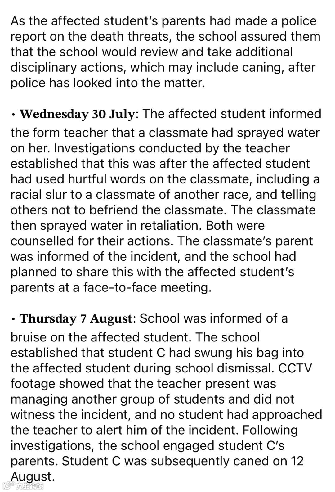 - 8月7日:校方接获女生身上出现淤伤的通知,调查确认系学生C在放学时甩书包不慎打中女生。