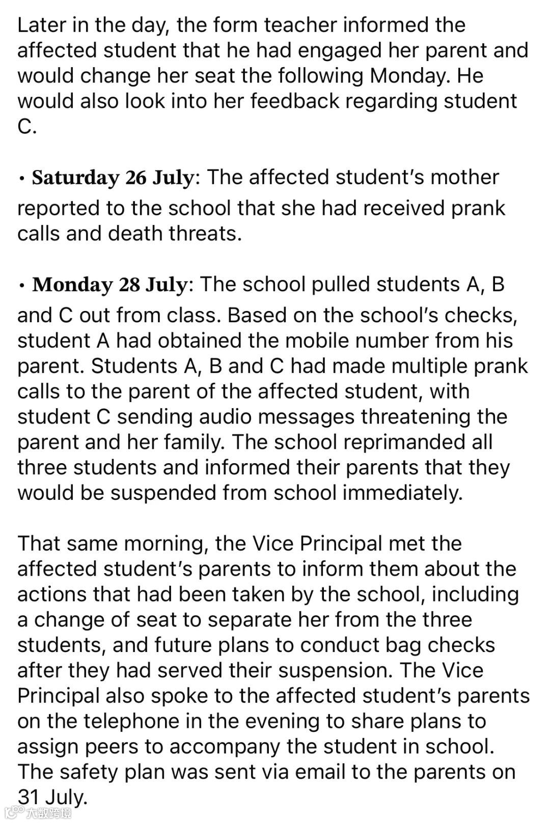 - 7月28日:校方调查确认,学生A擅自获取女生家长电话,A、B、C三人多次拨打骚扰电话,学生C还发送了威胁语音。三人即日被停课,副校长与女生家长会面并启动安全应对措施。
