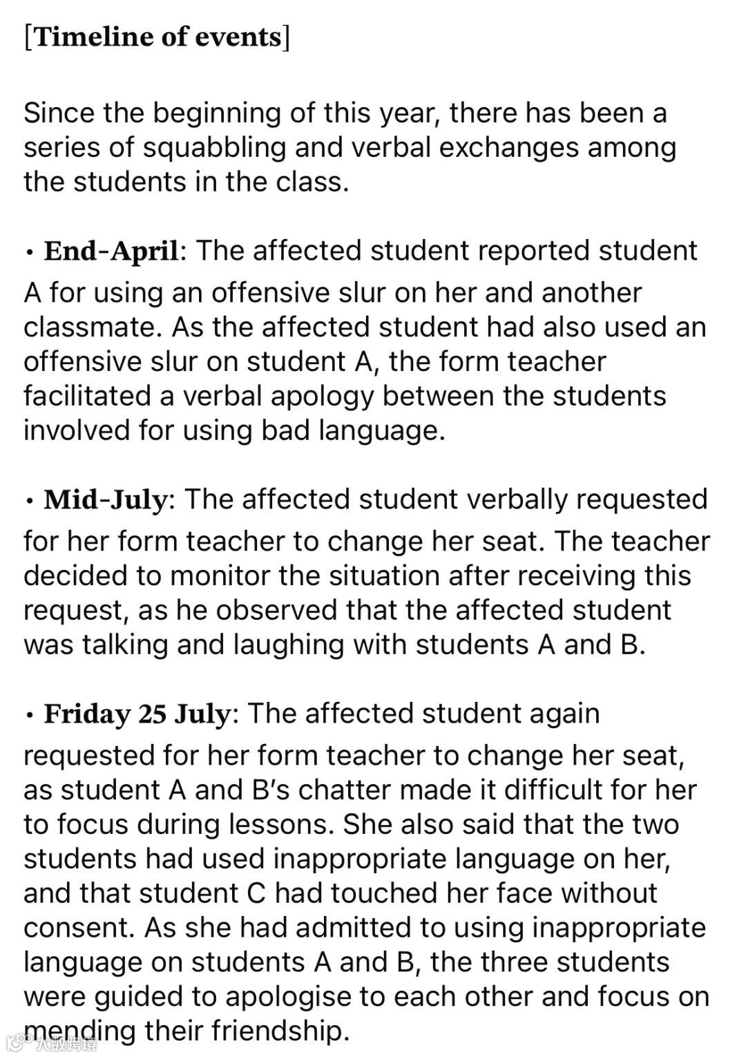 - 4月底:受影响女生举报学生A使用侮辱性言语,但她本人也有言语回应。班主任要求双方互相道歉。