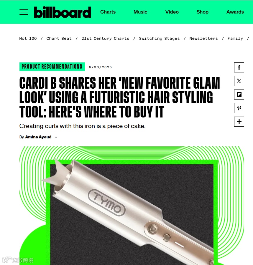 Billboard报道其与北美顶流明星Cardi B的联名合作。作为品牌忠实用户,Cardi B在日常造型中频繁使用TYMO产品,其影响力带动粉丝群体广泛关注。
