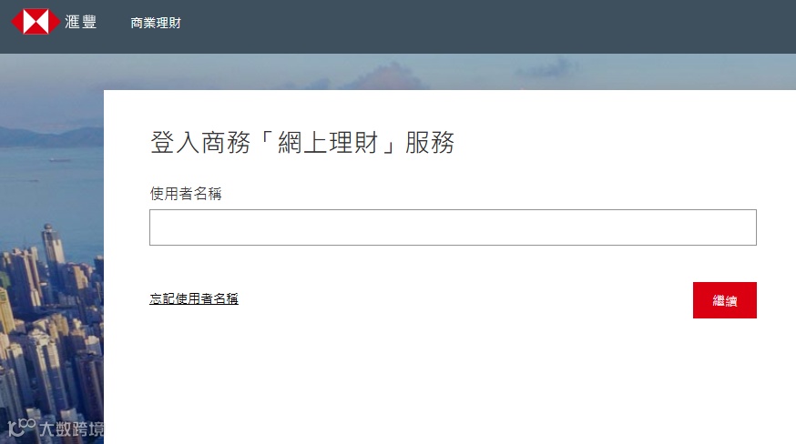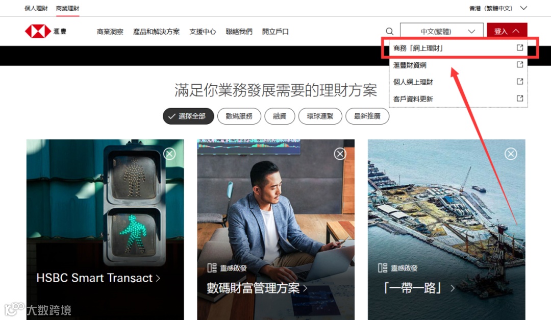 进入汇丰官网https://www.hsbc.com.hk,点击页面右上角「登入」按钮,在下拉菜单中选择「商务「网上理财」」,跳转至网银登录界面。