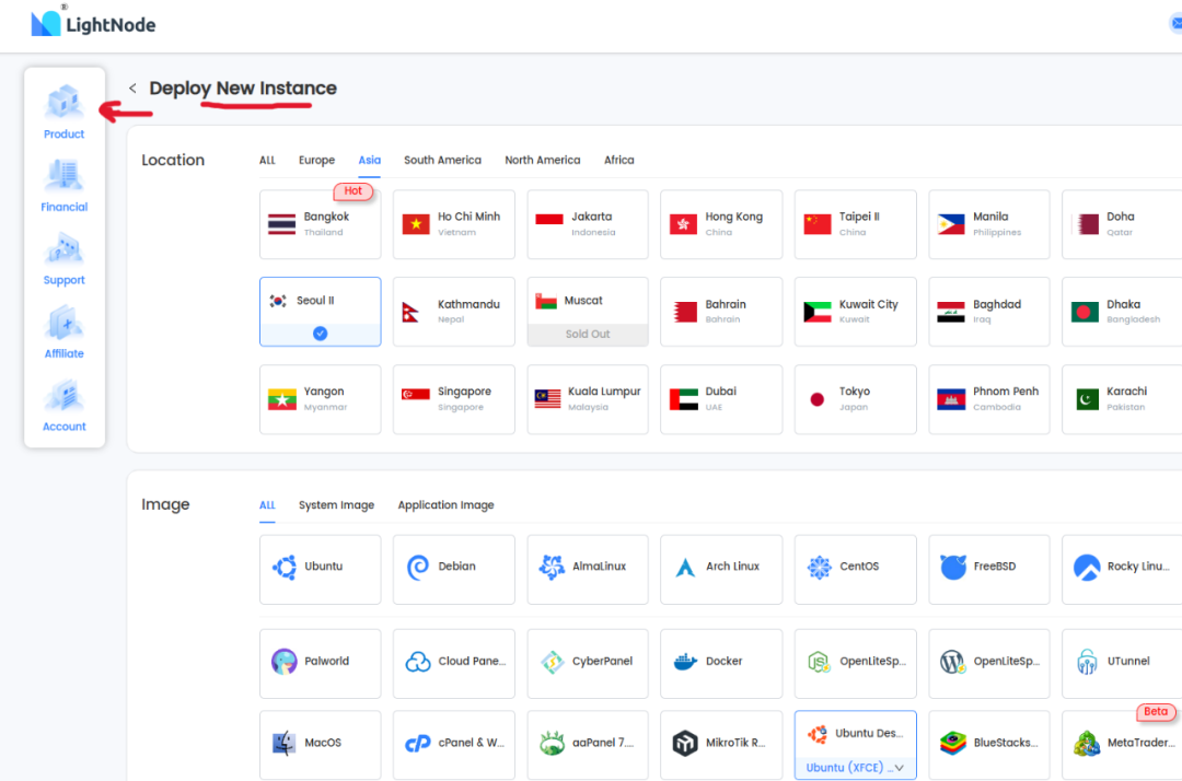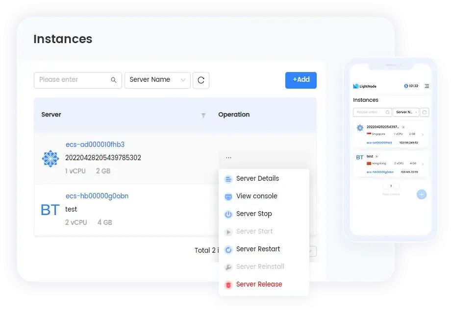 LightNode 实例的部署,也非常简单。点击:产品 - 实例- 添加,选择地区、系统或者应用,再选择配置、设置密码就行,几步就搞定。