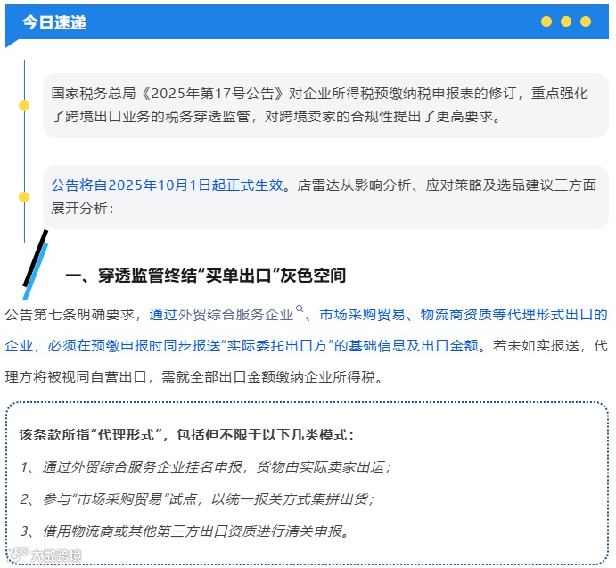根据国 税局通知,出口企业需在货物报关出口之日次月起至次年4月30日前的各增值税纳税申报期内收齐凭证申报退税,同时建议跨境卖家关注此前店雷达分享的《2025年第17号公告》对企业所得税预缴纳税申报表的修订,10月1日起正式生效,完整通知请看《国家税务总局公告:跨境出口也要实名申报,10月生效》。建议跨境卖家实时跟踪法规变动,调整选品策略以应对税率、认证等政策冲击。