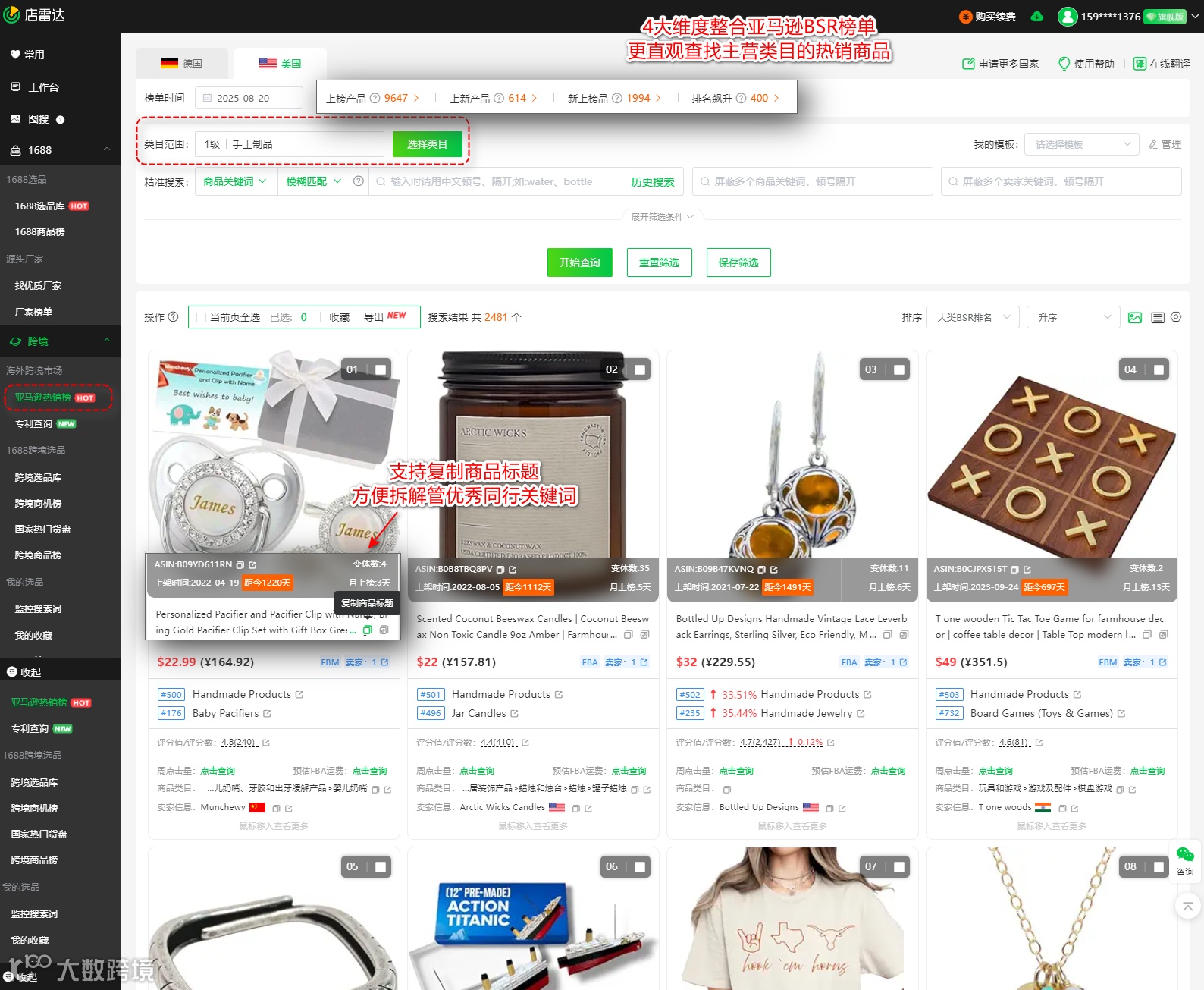 店雷达亚马逊热销榜通过整合近30天热销上榜产品、上新品、新上榜品、排名飙升4大维度亚马逊BSR榜单,可以更加直观查找主营类目的热销商品,是销量的间接反映,排名高说明销量和综合表现高,那么这类优秀同行的标题就非常有参考意义。