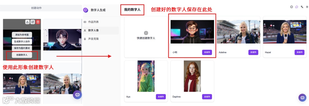生成的形象和动作可以归类保存,自定义命名,方便后续选用。保存的数字人像将显示在「我的数字人」里。