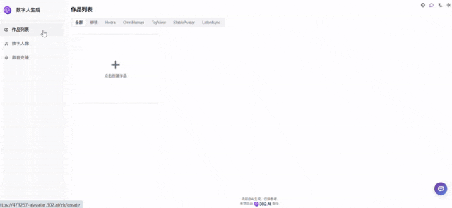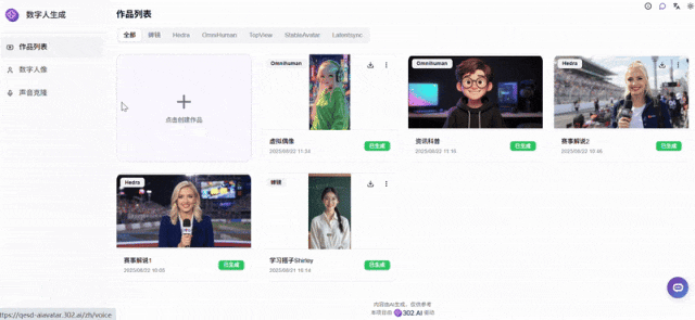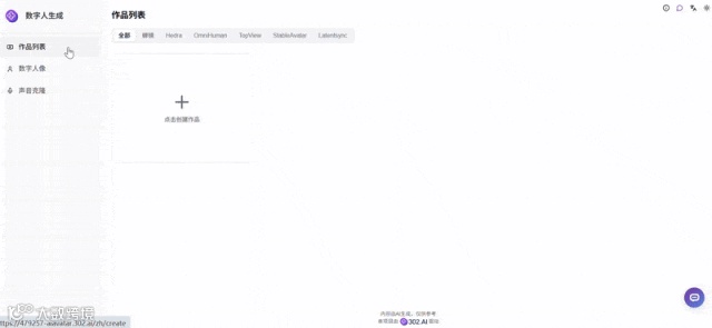 数字人生成工具分为三大板块:作品列表、数字人像和声音克隆。