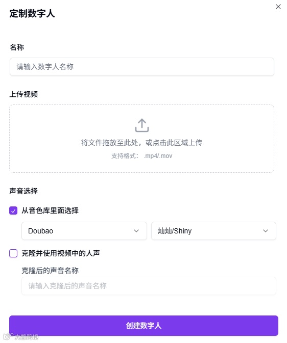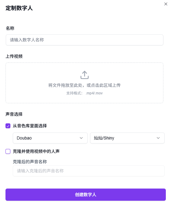 支持上传一段形象视频(支持格式为 mp4 与 mov)来生成专属数字人,并可选择克隆视频中的人声。