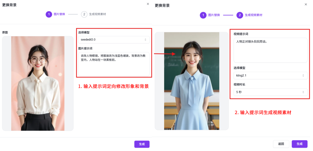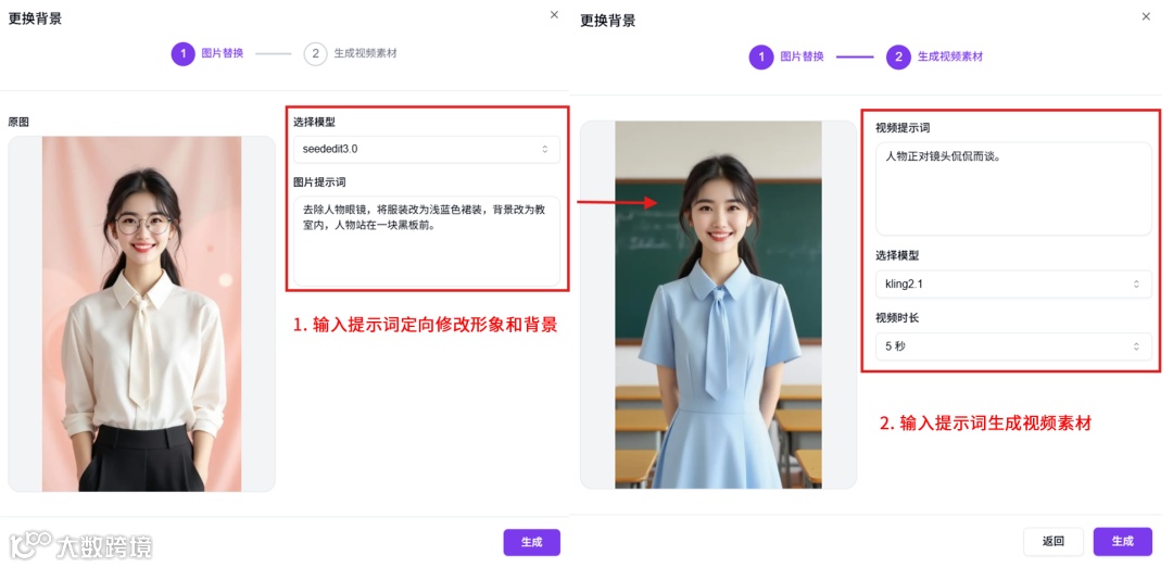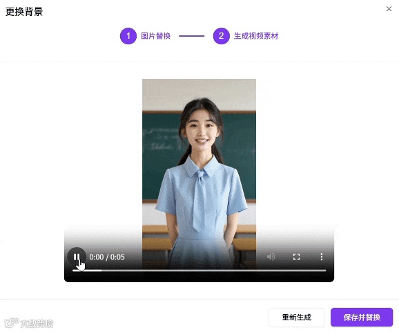 人物形象/环境背景修改后,输入提示词后可生成一段供后续使用的视频素材。