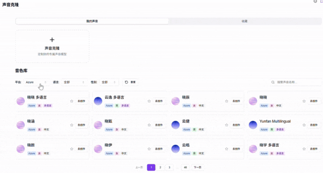 音色库提供丰富的音色资源,可按照平台、语言和性别进行筛选,选择心仪音色点击「去创作」可直接跳转到创作界面。