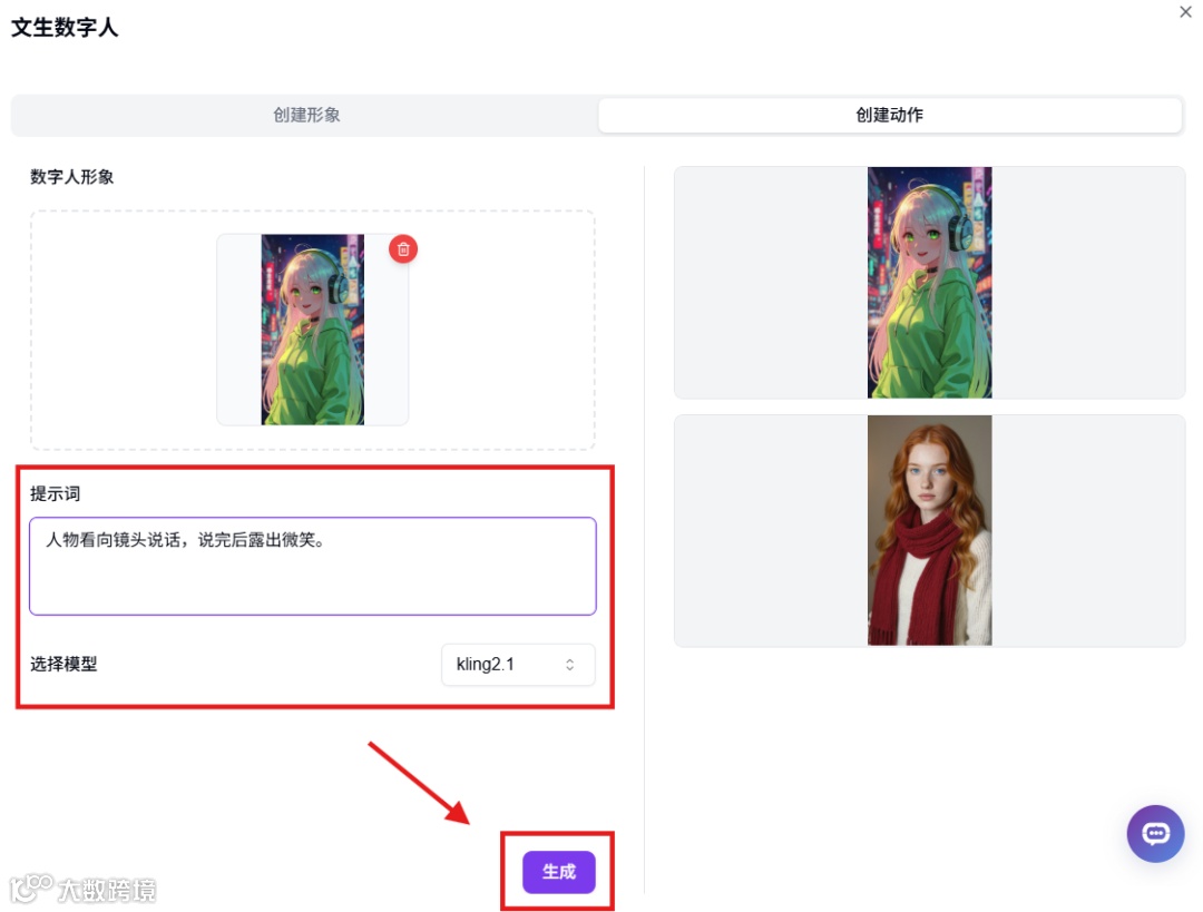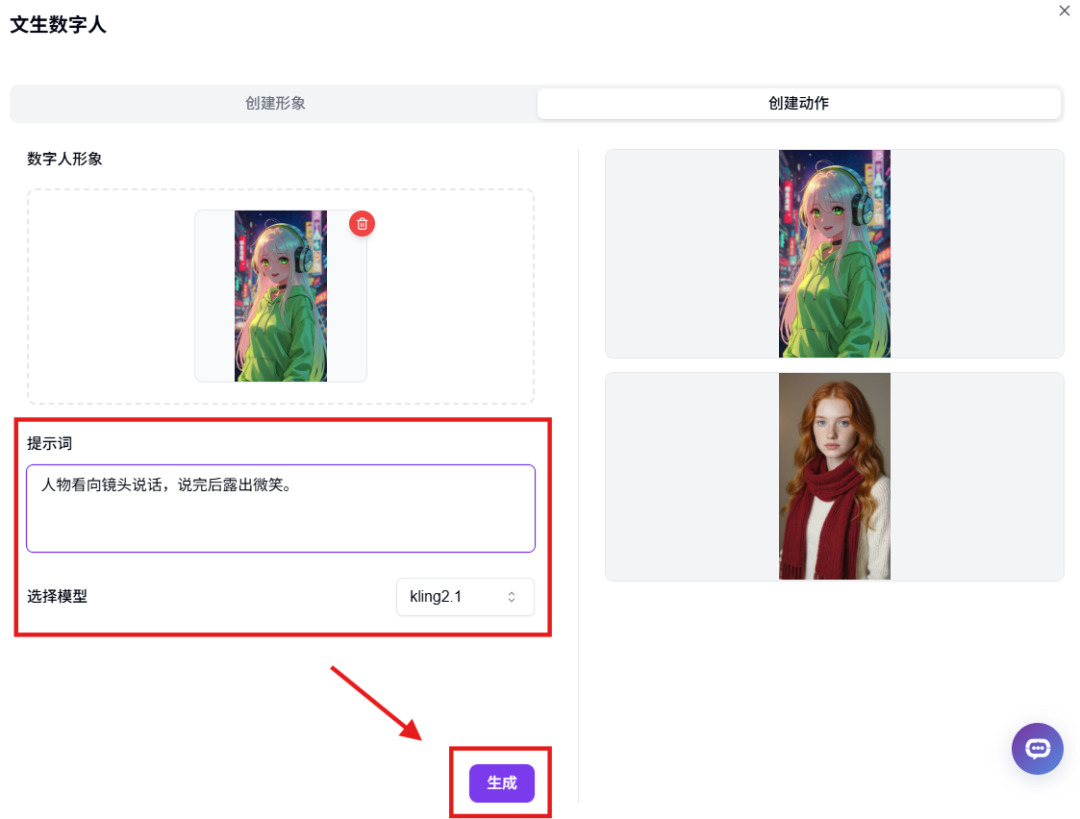 形象创建完成后,使用提示词为形象创建动作,创建好的动作视频会显示在右侧工具栏。