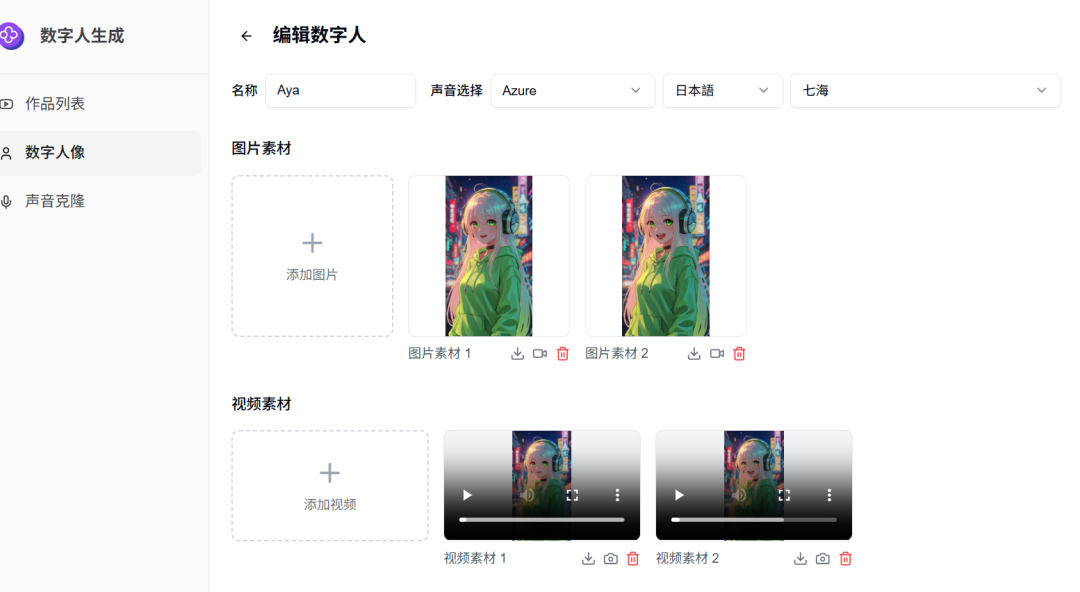 对数字人进行单独编辑,可手动添加更多图片和视频素材,用以生成不同的表情和肢体动作。