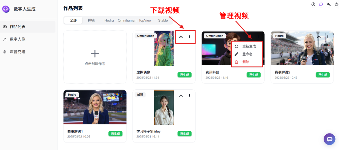 所有已生成的作品将显示在「作品列表」里,可以在此进行下载、重新生成、重命名、删除等操作。
