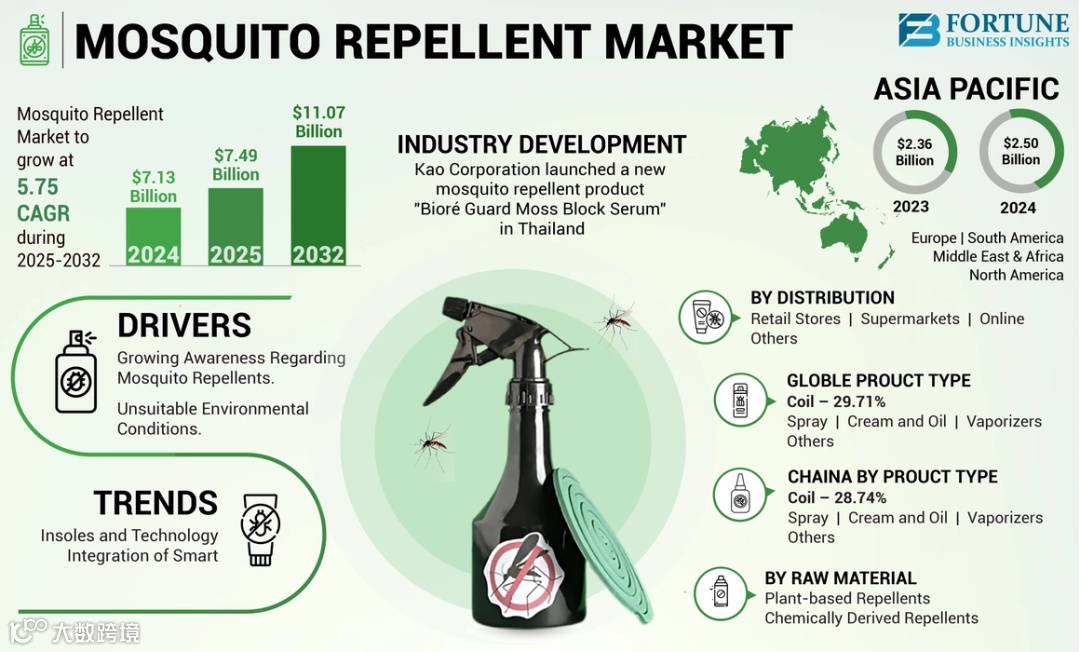 全球驱蚊产品市场规模持续增长。据Fortune Business Insights数据,2024年市场规模达71.3亿美元,预计2032年将攀升至110.7亿美元,复合年增长率5.75%。