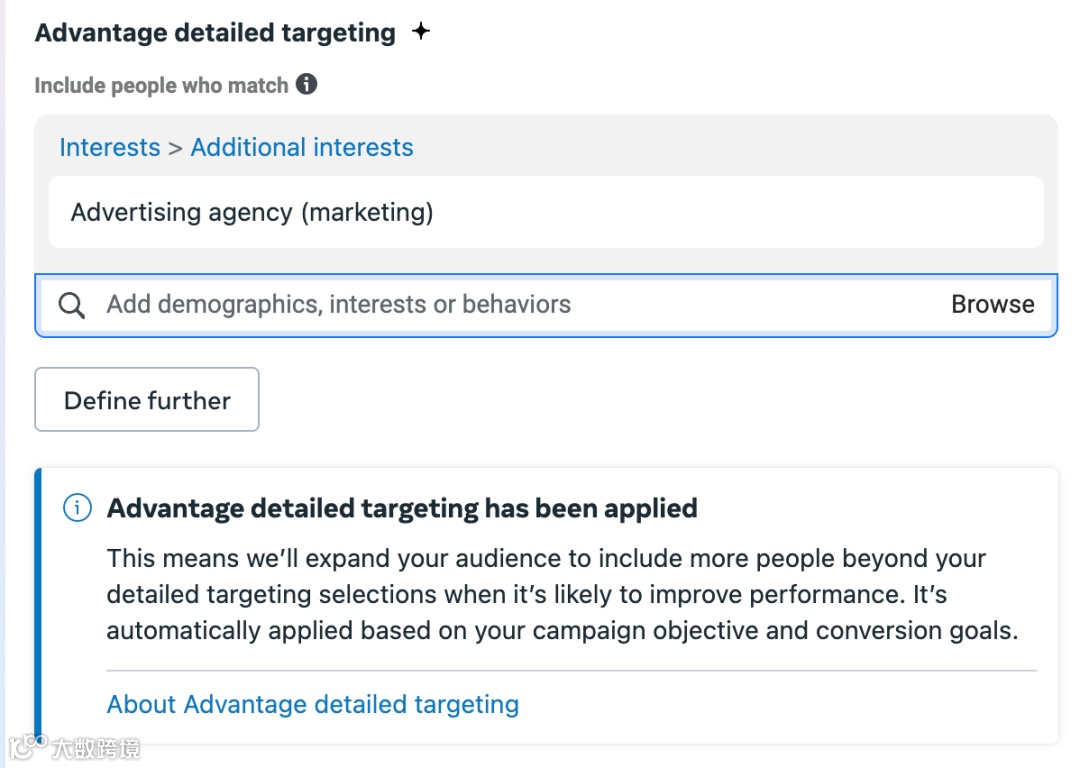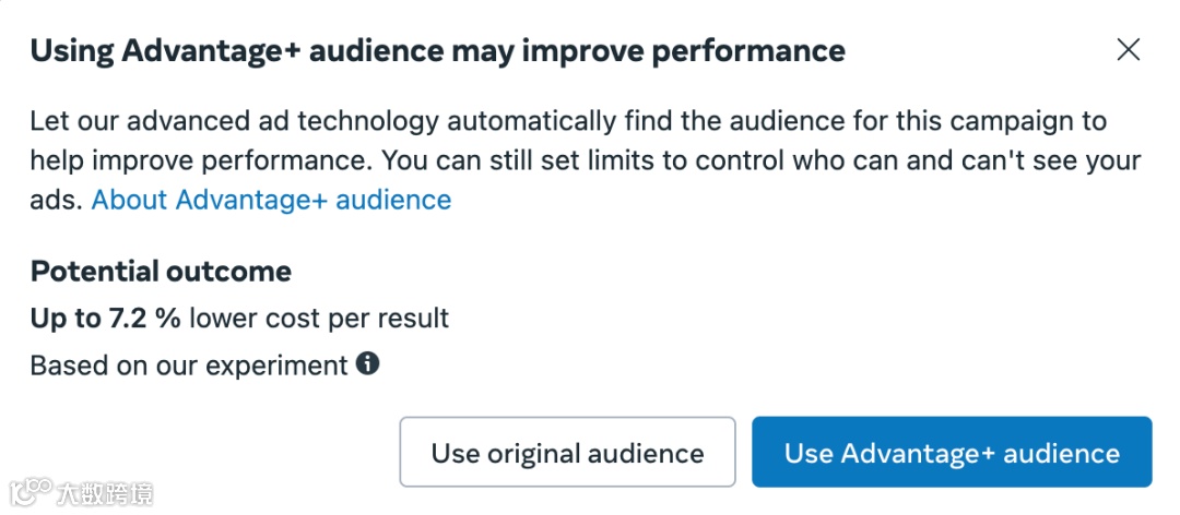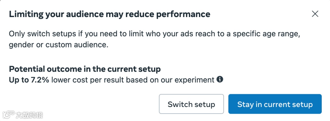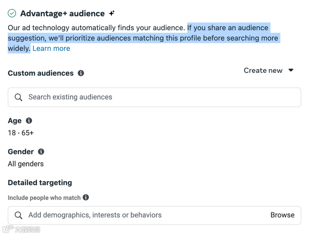 经全面对比,Advantage+并未削弱广告主的受众控制能力。无论是年龄、性别、自定义受众、相似受众还是详细定位,均可通过“进一步限制广告范围”实现与原始受众相同的控制效果。