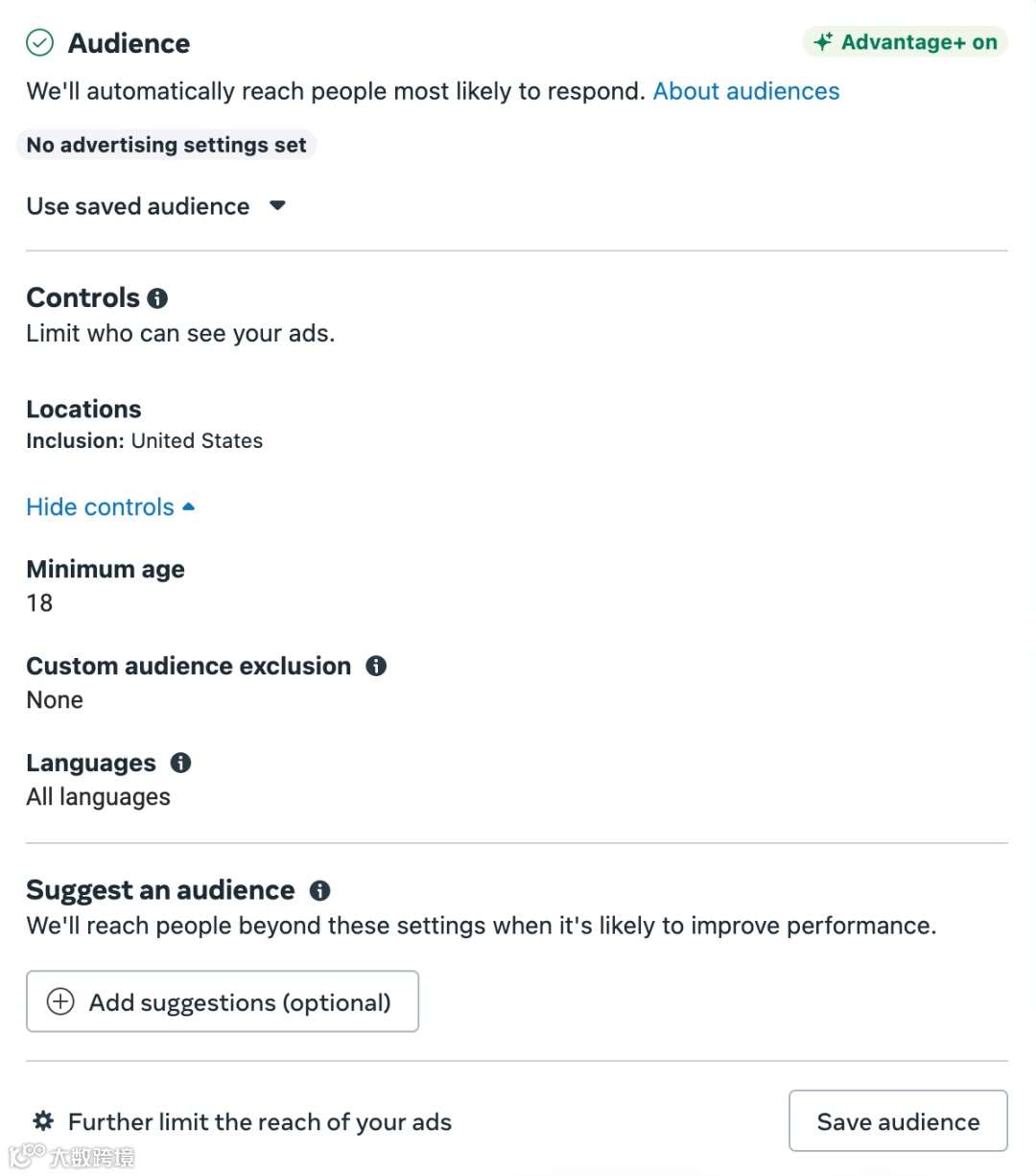 新版Advantage+将受众控制与系统建议整合至同一界面。“转向原始受众”选项已被“进一步限制你的广告范围”取代。