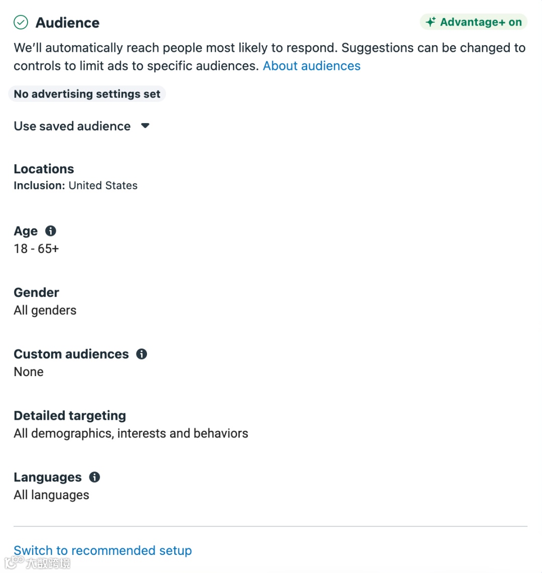 当前创建销售类广告活动时,界面已全面更新。虽然Advantage+设置更简洁,且默认推荐使用系统建议,但关键在于:广告主的实际控制能力是否受损?以下将逐项分析各类受众设置的控制力变化。
