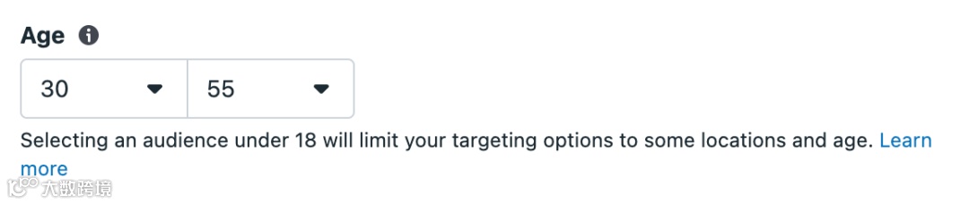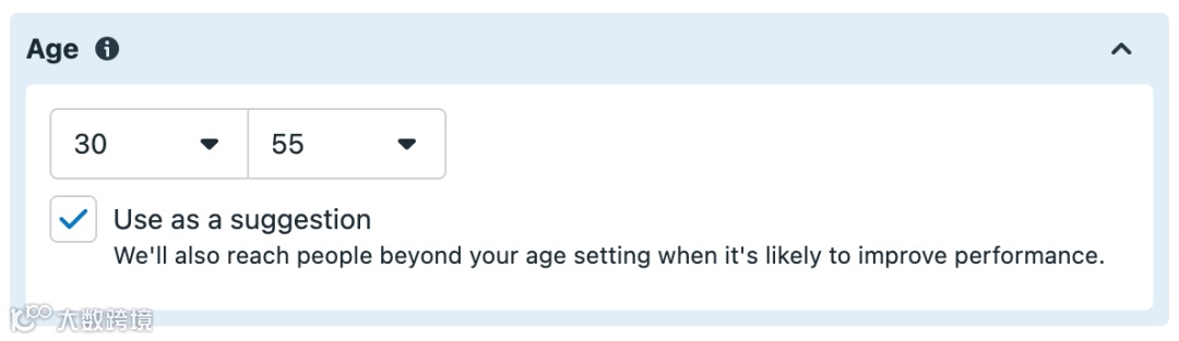 旧设置:使用默认“Advantage+受众”时,仅最低年龄为控制项(上限25岁),最大年龄为建议值。切换至原始受众后,年龄范围可完全自定义,如30-55岁,且为严格控制。