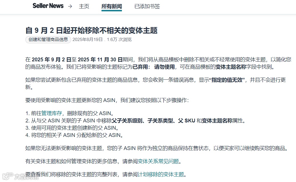 亚马逊将于9月2日开始删除不相关或不经常使用的变体主题,旨在简化卖家商品发布流程。此次调整共涉及74,460个变体主题,对依赖多变体链接冲榜的卖家影响显著。
